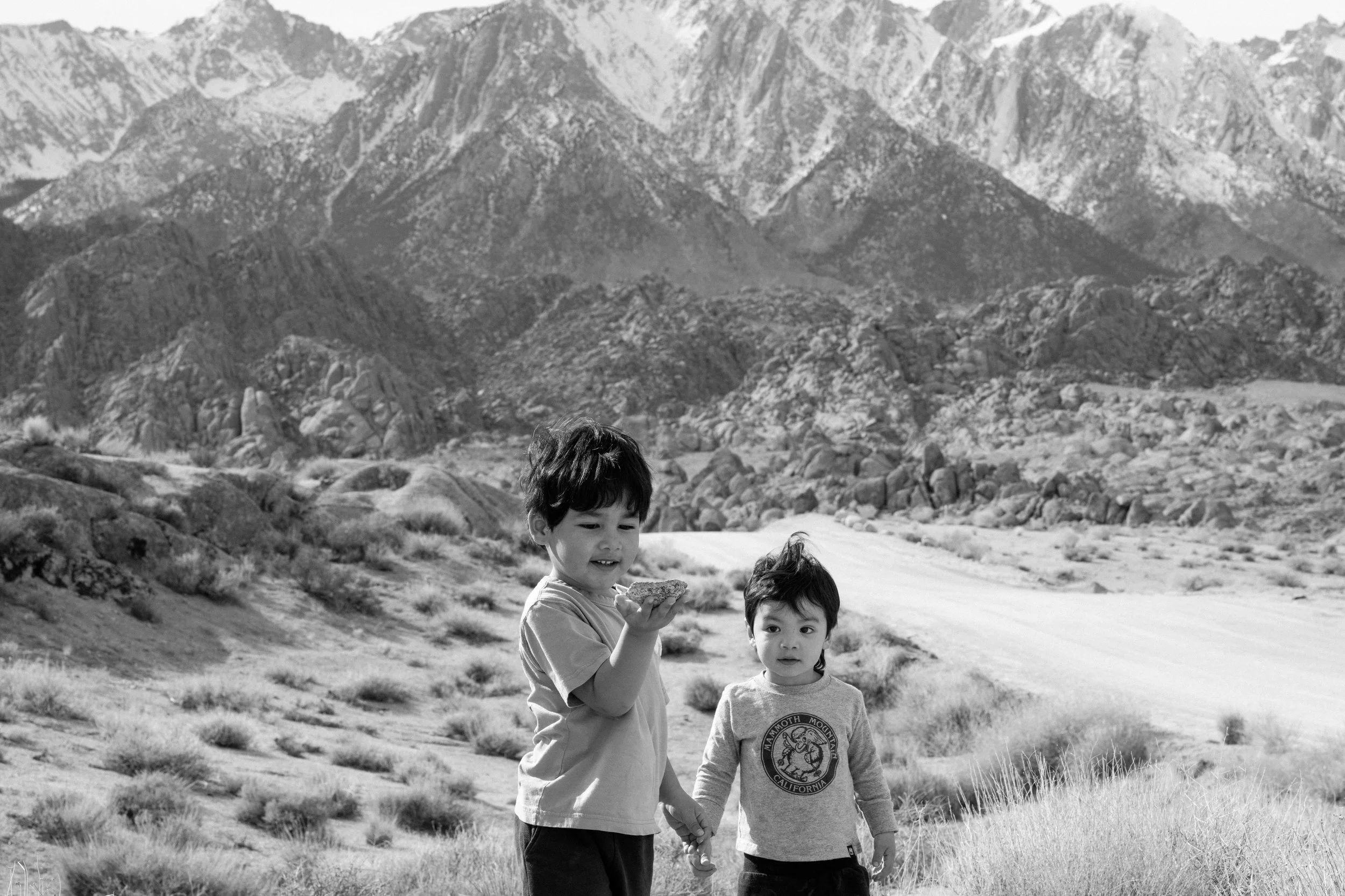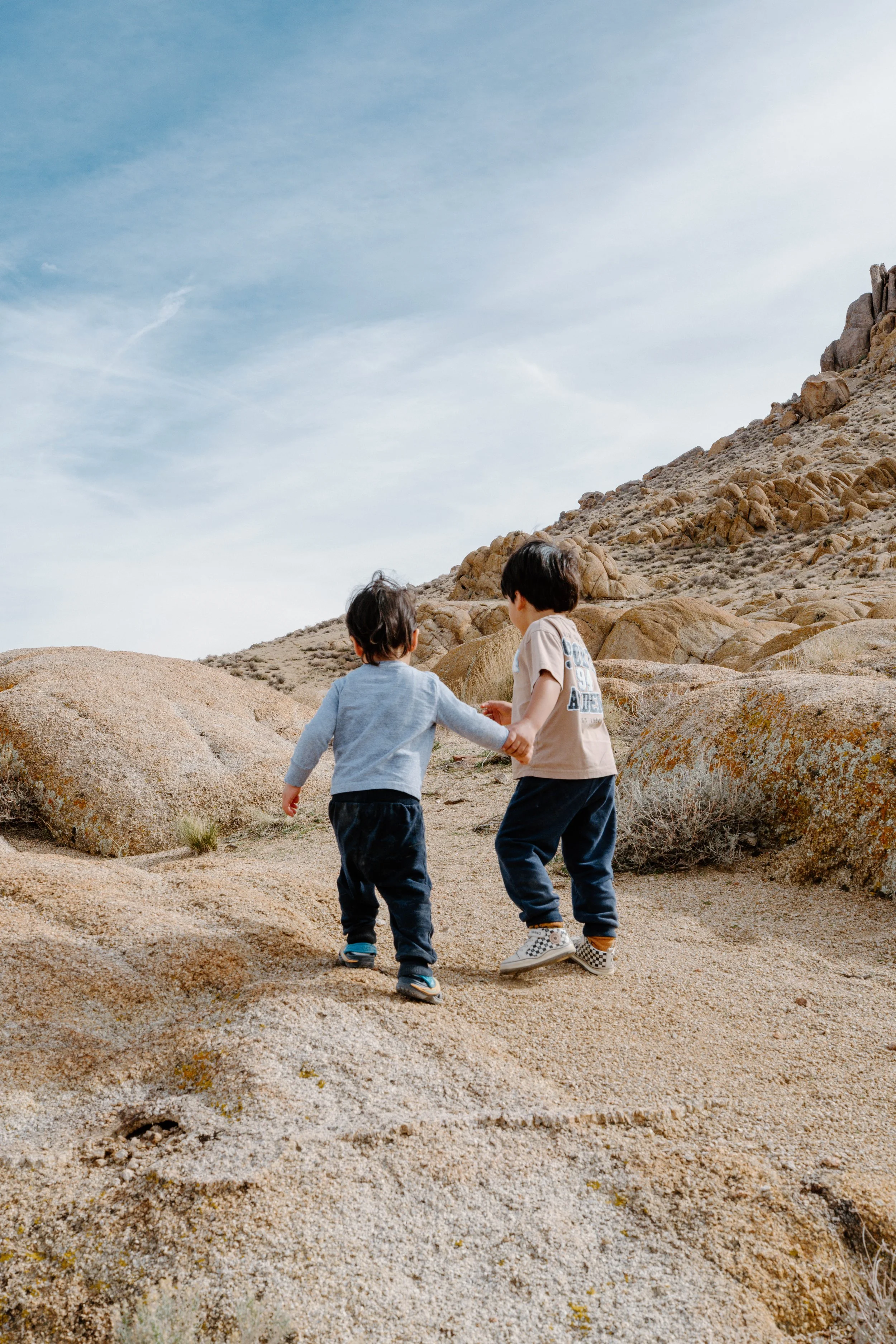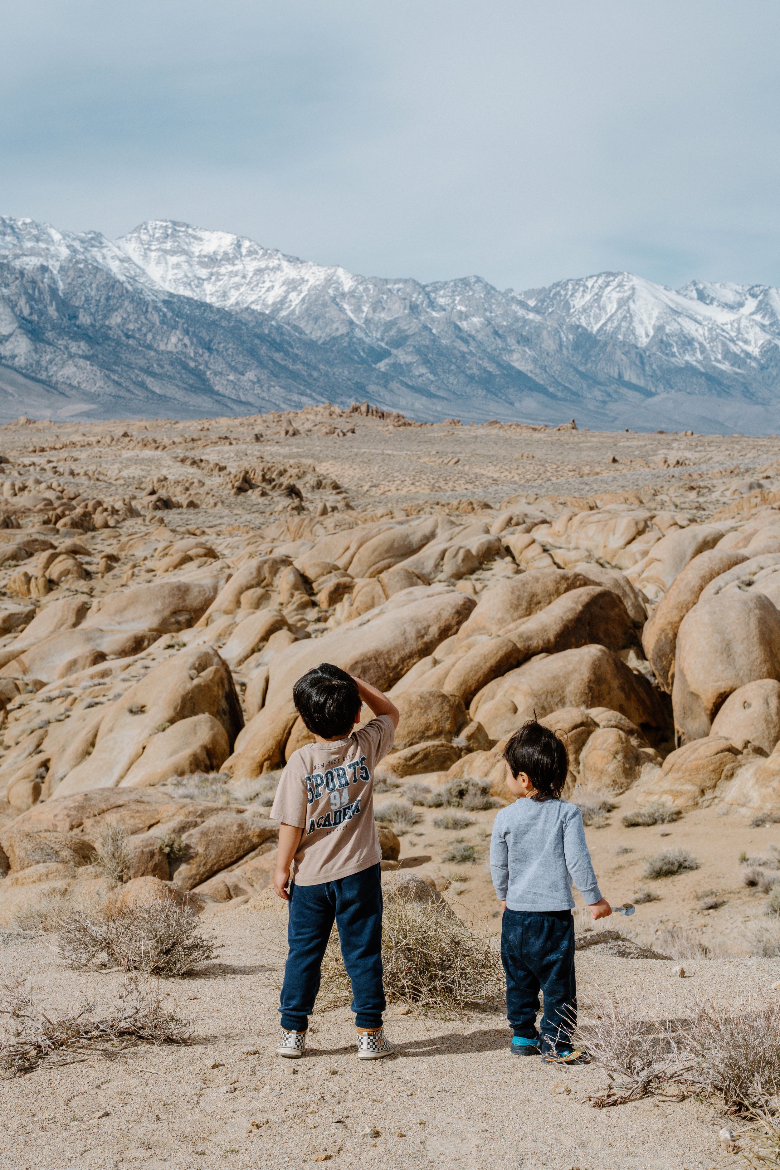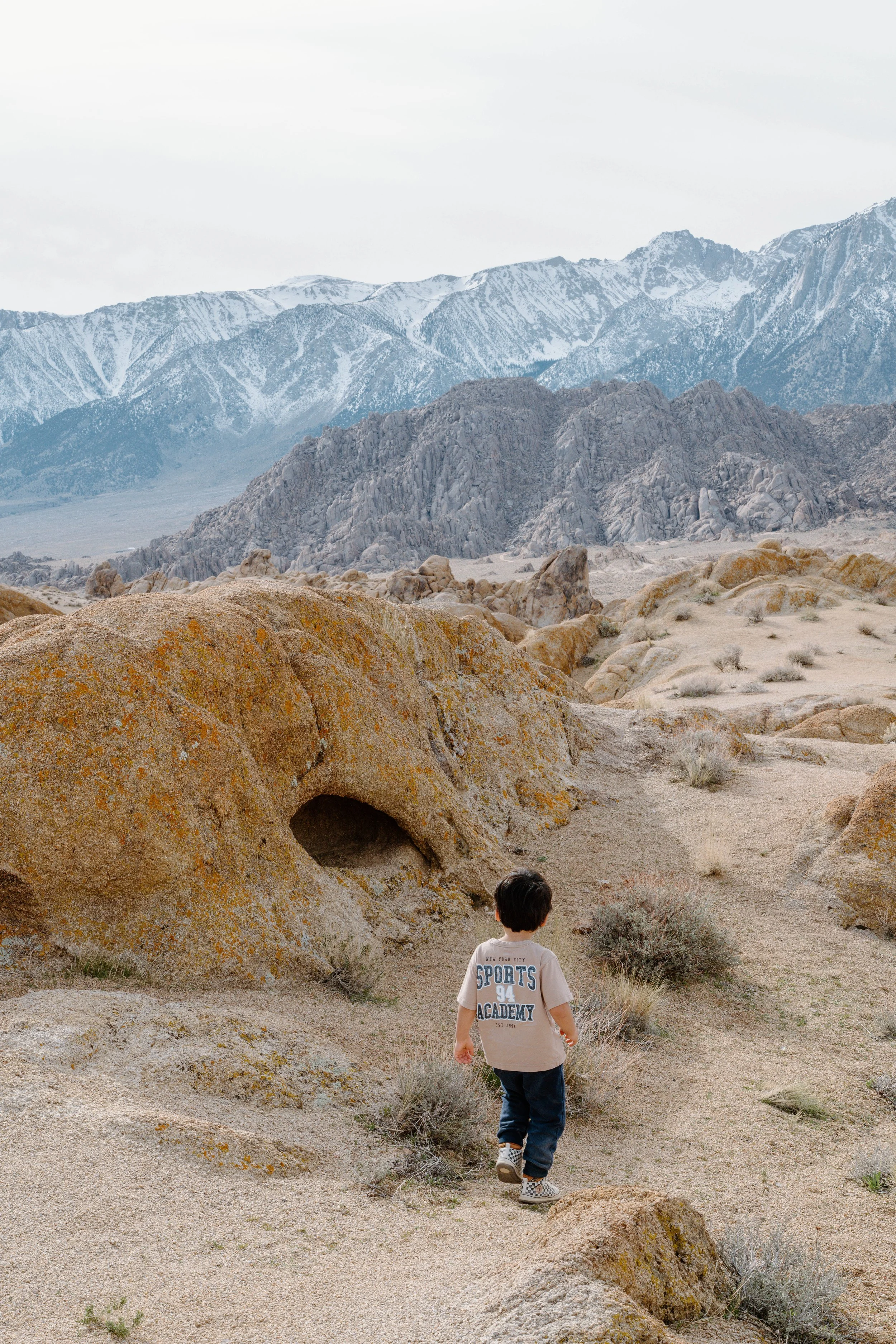 Our pit stop on the way home. This is one of those spots where the desert meats the tallest mountain in the United States standing at 14,500 feet, Whitney. Judah kept saying “mommy this is the desert” and it was hard for me to understand that because YES there are giant boulders and a few cactus here that remind us of Joshua Tree (another place he has been that probably reminded him of it). But looking into the distance and seeing the towering mountains covered in snow make you question everything. What is this place? It feels unworldly in the best ways. The boys ate their lunch, stopping to climb a rock or two between each bite. It was the perfect little boy playground in the middle of our 6 hour car ride home. We feel lucky that CA offers so many landscapes that give us joy and inspiration. It was a great reminder that detouring off our path, taking a long breaks to get the wiggles out, and filling up our tanks mentally and physically (the car included) is always worth it.