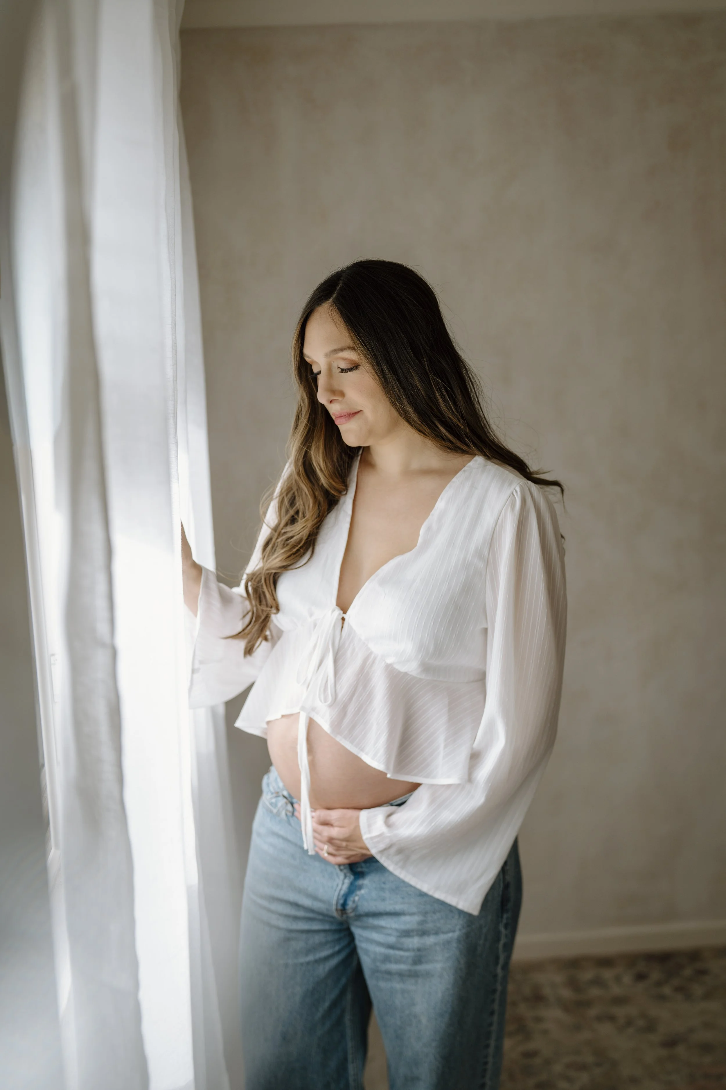 Natural light studio maternity sessions are available by appointment and can be paired with: