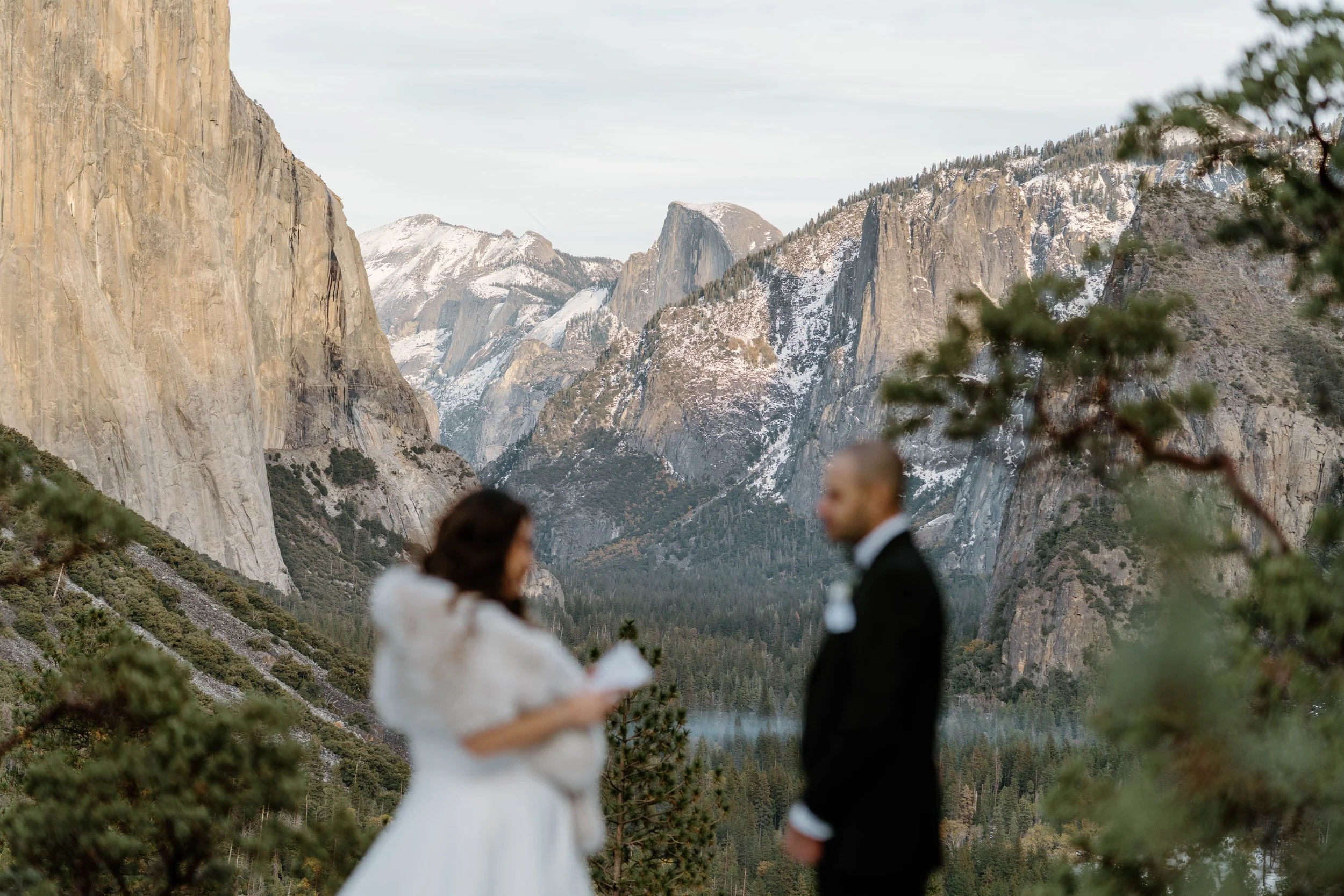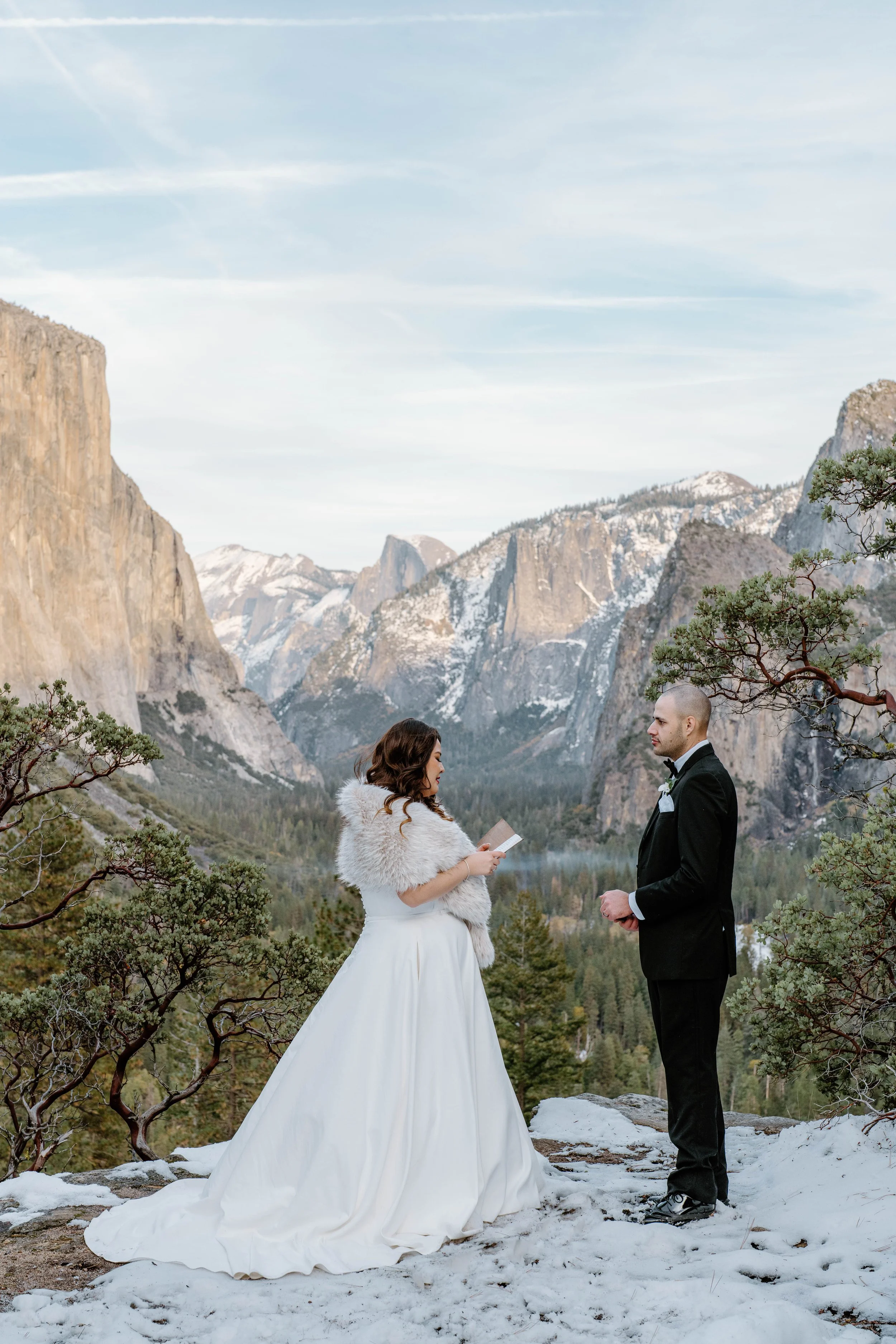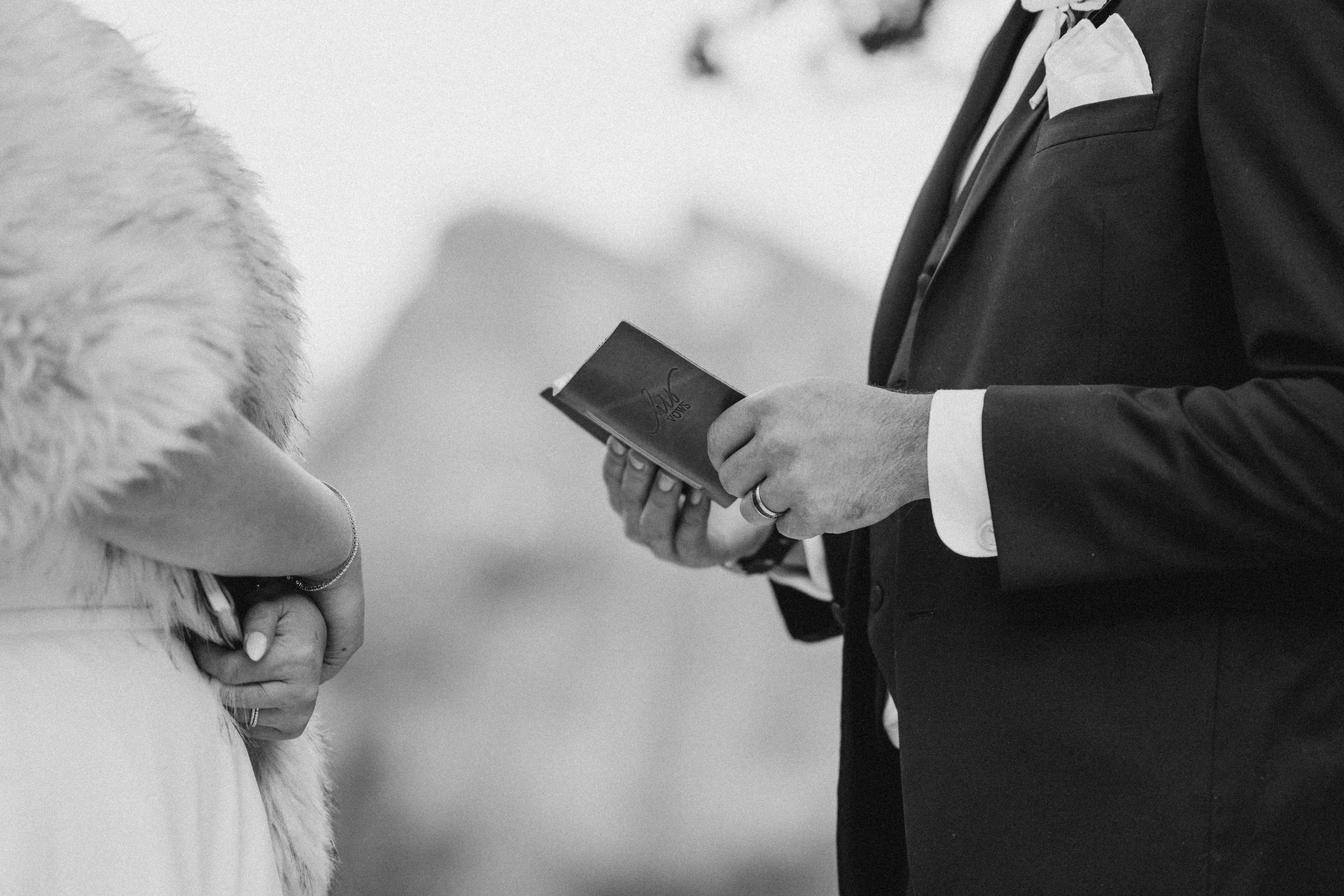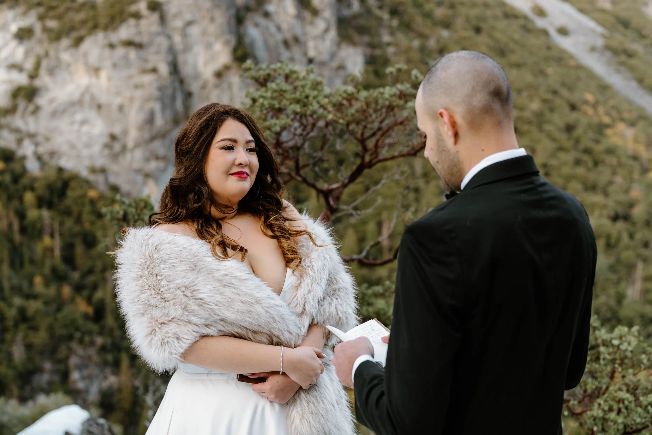 Snow settled softly along the cliffs. The air felt still, almost reverent. And tucked into it all were Amanda and Omar, standing across from each other, reading vows that felt like they belonged to the mountains just as much as they did to them.